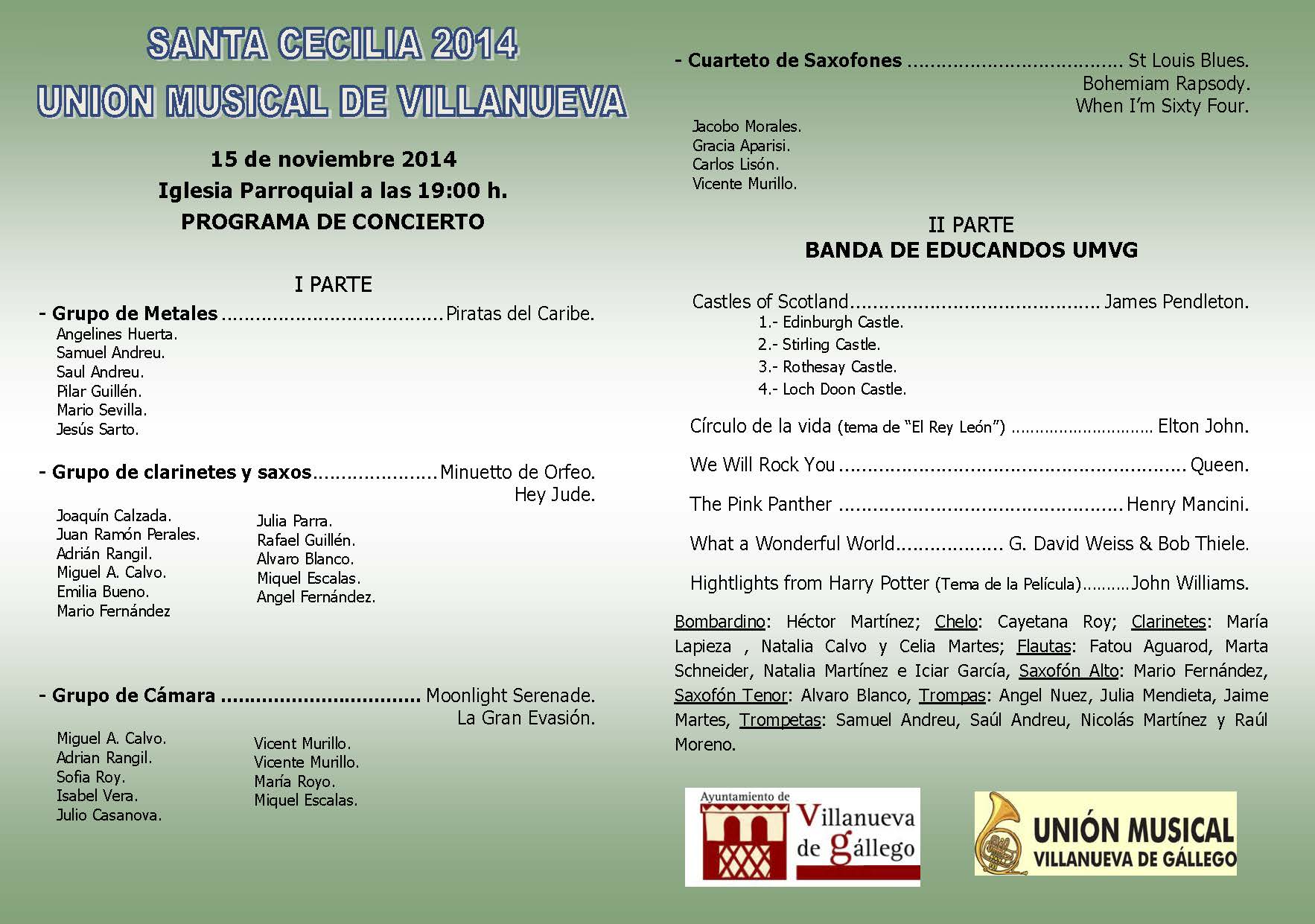 El próximo Sábado 15 de noviembre, tendrá lugar el primero de los dos conciertos de Santa Cecilia, en el que participan grupos instrumentales de la unión musical de Villanueva y la Banda de Educandos.